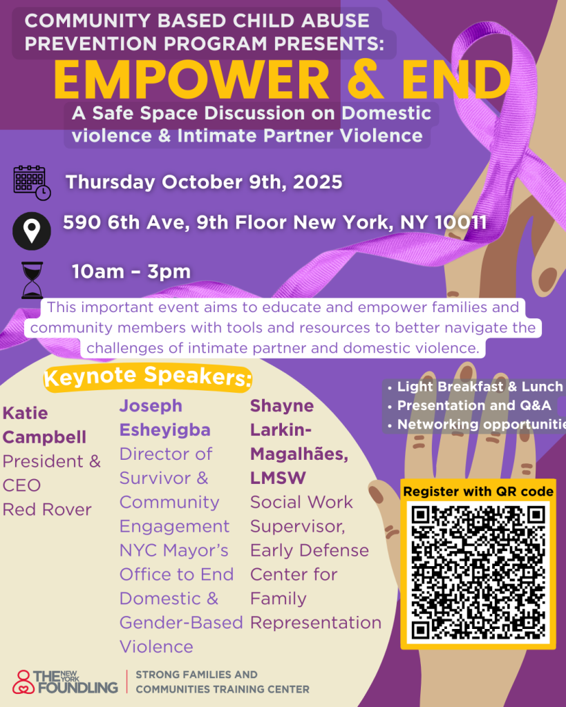 Join us on October 9th for New York Foundling’s in-person event, Empower & End: A Safe Space Discussion — focused on promoting safety, advocacy, and holistic support for individuals and families affected by domestic and intimate partner violence. Kindly share this flyer within your network. Scan the QR code to RSVP for this in-person event.