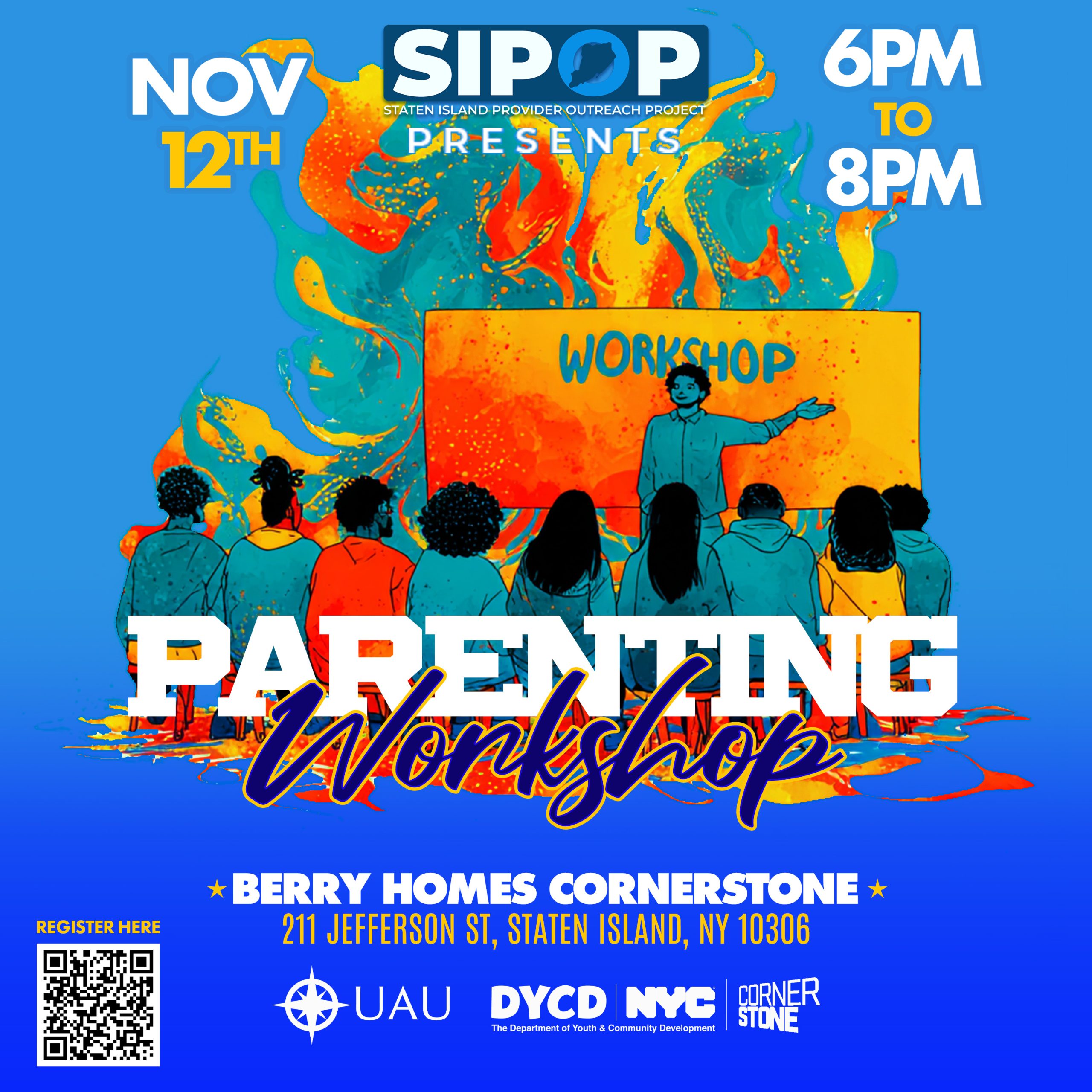 SIPOP Parent Workshop at Berry Homes Cornerstone Topic: General Parenting Time: 6pm-8pm Place: 211Jefferson Street SINY 10306 Refreshments Served   Register Here: https://uaufatherhoodmatters.com/sipop_apply.php